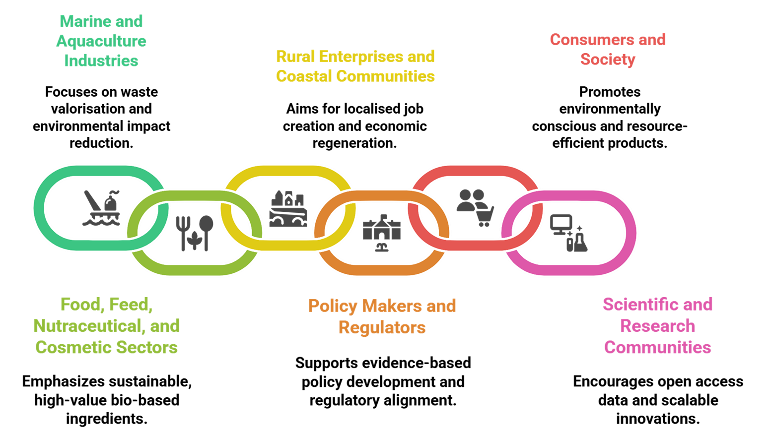 • The macroalgae value chain will begin with the production of the four species of macroalgae at three sites, followed by their on-site preservation of macroalgae. Subsequently the stabilised macroalgae biomasses will undergo conversion through use of advanced technologies for producing a wide of array of food products, food and feed ingredients, and high value bioactive compounds.